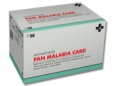 Advantage PAN Malaria Card is a rapid, visual and sensitive immunoassay for the qualitative diagnosis of all four Plasmodium Species (P.falciparum/P.vivax/P.malariae/P.ovale) based on pLDH antigen in human whole blood only.