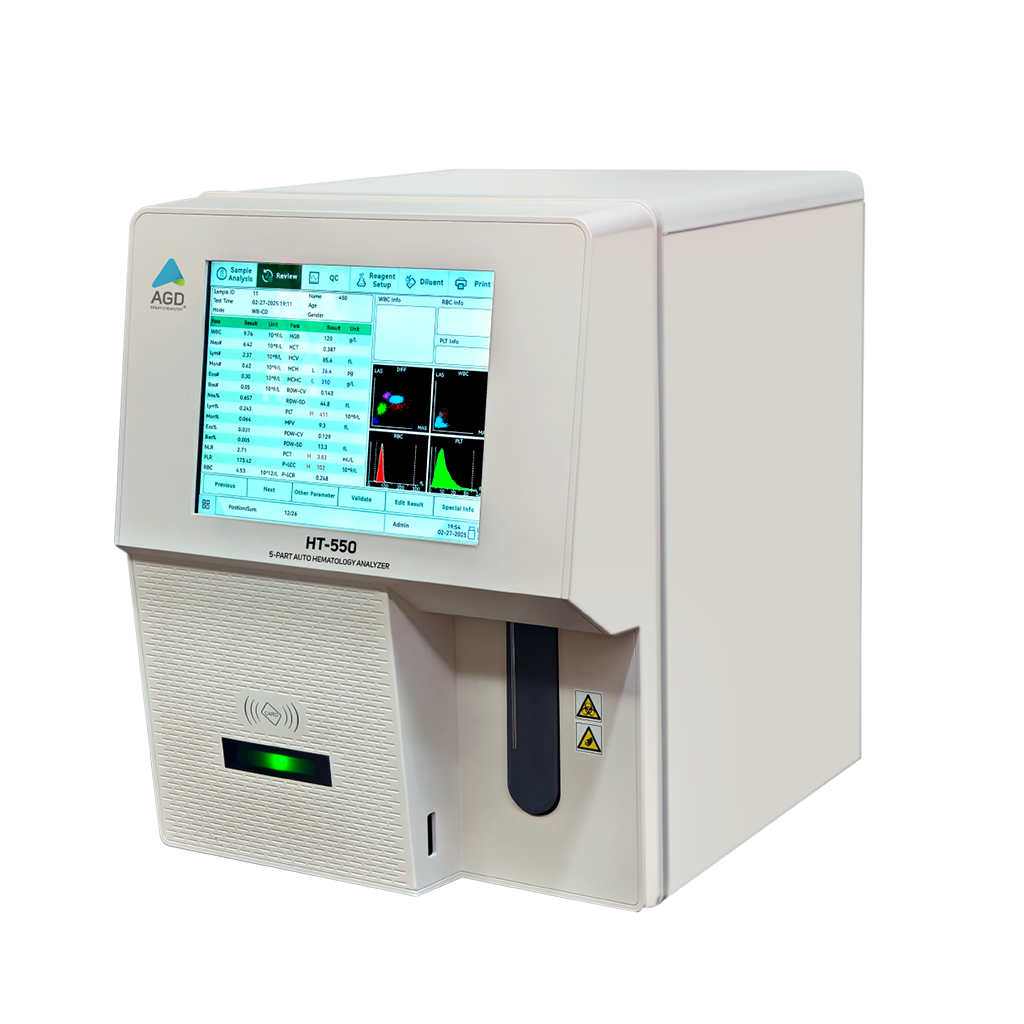 The HT-550, 5-Part Auto Hematology Analyzer is an advanced diagnostic instrument designed for comprehensive blood analysis. It offers high-precision and fully automated testing, providing differential white blood cell (WBC) counts, red blood cell (RBC) parameters, platelet counts, and other critical hematological indices. With Tri-angle laser scattering and flow cytometry for precise WBC differentiation and counting, impedance technology for RBC and PLT measurement, and a cyanide-free method for hemoglobin (HGB) analysis, ensures high accuracy, efficiency, and environmental safety in hematological diagnostics.