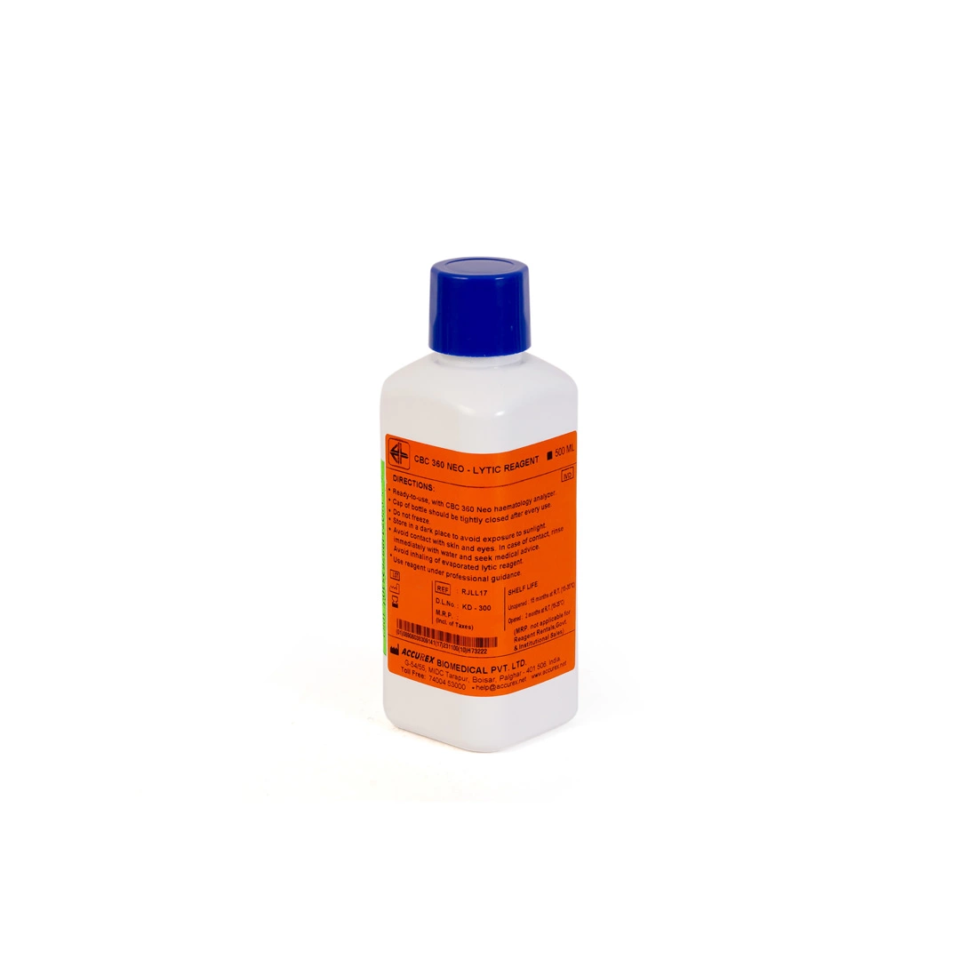 Buy Hematology Analyzer CBC 360 Neo Lytic Reagent 500ml Online from Accurex. The lytic reagent composition is used to lyse red blood cells & preserve leukocytes. Lytic reagents are also used as the sheath reagent for the focus flow measurement.