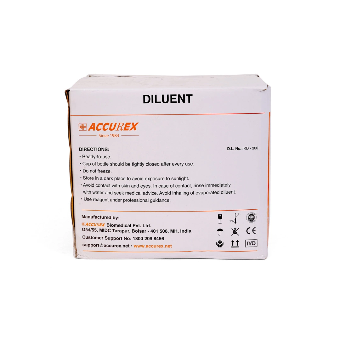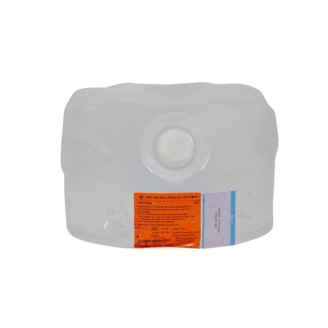 Buy Hematology Analyzer CBC 360 Neo RFID Diluent 20L Online from Accurex. RFID Diluents in Hematology Analyzers are solutions used before hematology testing to dilute blood samples in clinical settings. Diluents may include solutions for use in blood cell counting & sizing & flow cytometry.