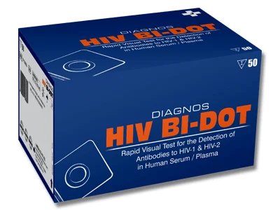 The Diagnos HIV BI-DOT Test is a visual, rapid, sensitive and accurate immunoassay for the detection of HIV-1 & HIV-2 antibodies (IgM,IgG & IgA) in human serum or plasma using HIV-1 & HIV-2 Antigens immobilized on an immunofiltration membrane. The test is a screening test for Anti HIV-1 and HIV-2 and is for in vitro diagnostic use only.