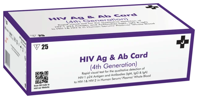 HIV Ag & Ab Card (4th Generation) is a visual, rapid qualitative and sensitive solid phase immunochromatographic assay for the differential detection of HIV-1 p24 Antigen and Antibodies (IgM, IgG & IgA) to HIV-1& HIV-2 in Human Serum/ Plasma/ Whole blood (collected by venipuncture or Fingerprick). The test is a screening test for p24 antigen (HIV-1) and HIV antibodies (anti-HIV-1 & anti-HIV-2) and is for in vitro diagnostic use only. It is intended for screening of blood donors or other individuals at risk for HIV-1 & HIV-2 infection and for clinical diagnostic testing. It is a screening test for p24 antigen (HIV-1) and HIV antibodies (anti-HIV-1 & anti-HIV-2). The test is for in vitro diagnostic use only and is intended for screening of blood donors or others individuals at risk for HIV-1 and/or HIV-2 infection and for clinical diagnostic testing.
