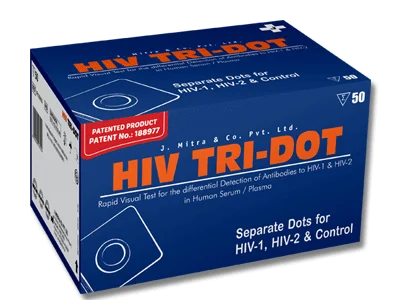 The HIV TRI-DOT test is a visual, rapid, sensitive and accurate immunoassay for the differential detection of HIV-1 & HIV-2 antibodies (IgG,IgM & IgA) in human serum or plasma using HIV-1 & HIV-2 Antigens immobilized on an immunofiltration membrane. The test is a screening test for Anti HIV-1 and HIV-2 and is for in vitro diagnostic use only.