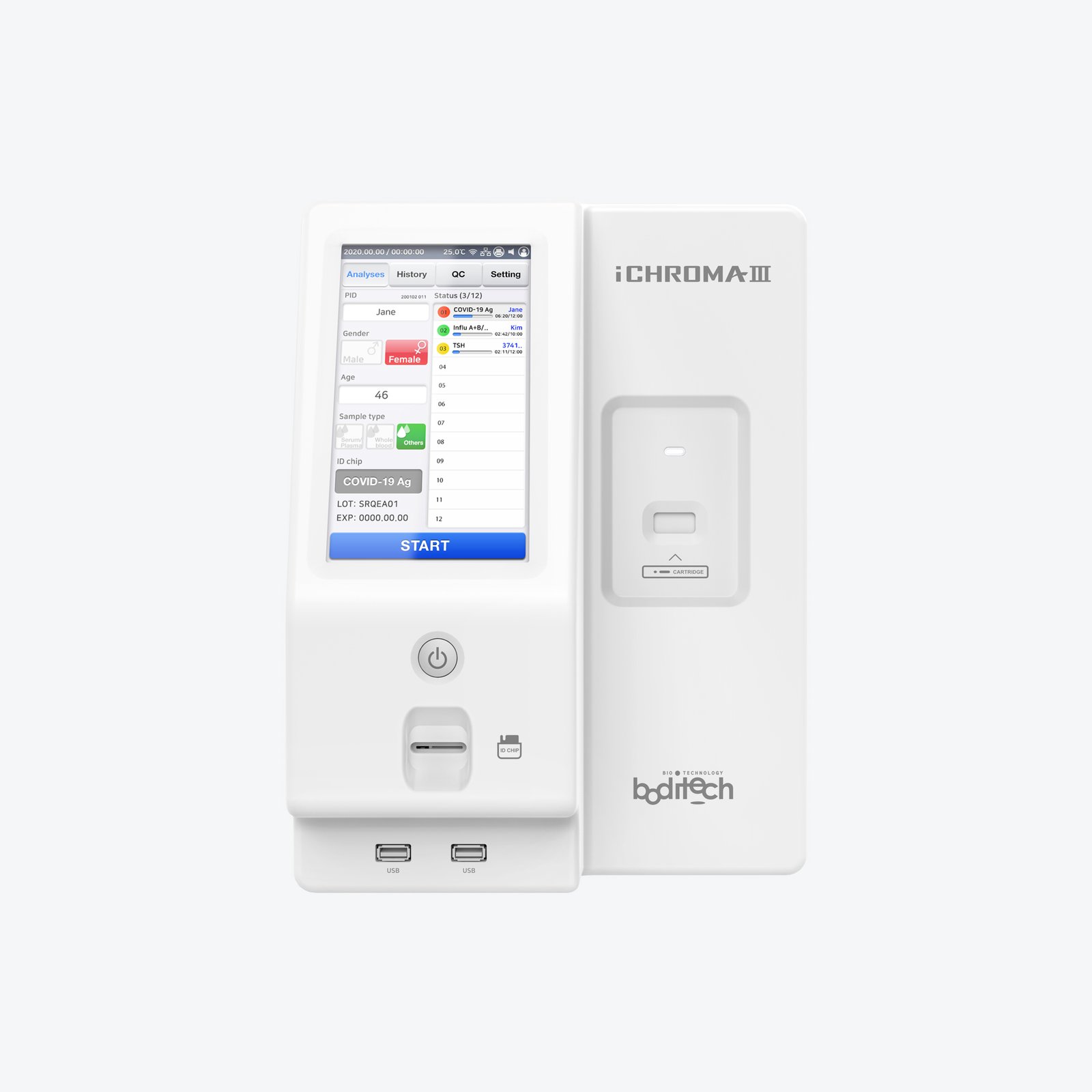 ichroma™ III accepts cartridges for various biomarkers in random sequence and processes them in a preset temperature, even combines test parameters with differing incubation period. The user will prepare each cartridge before inserting it to the system, one at a time.