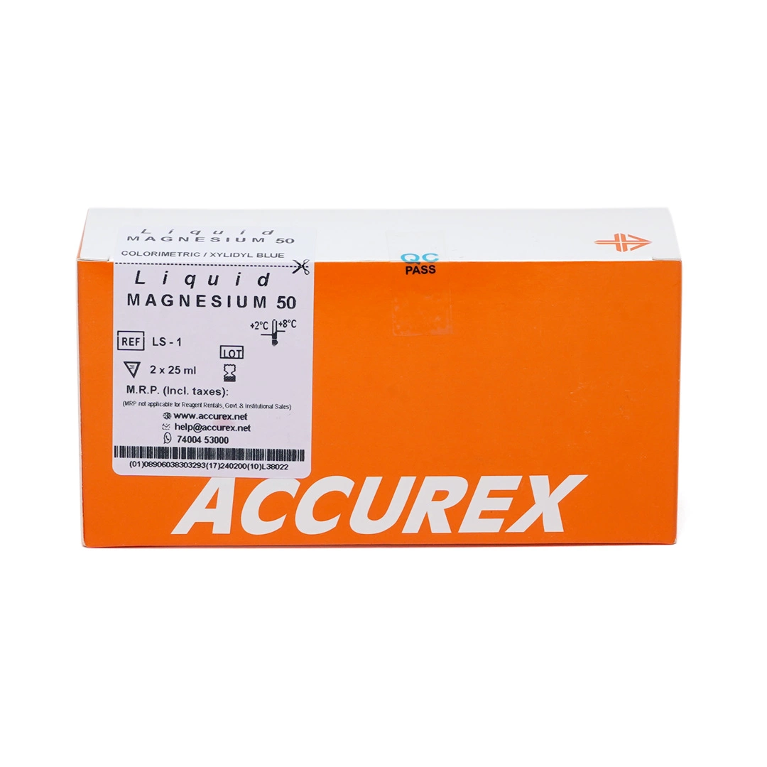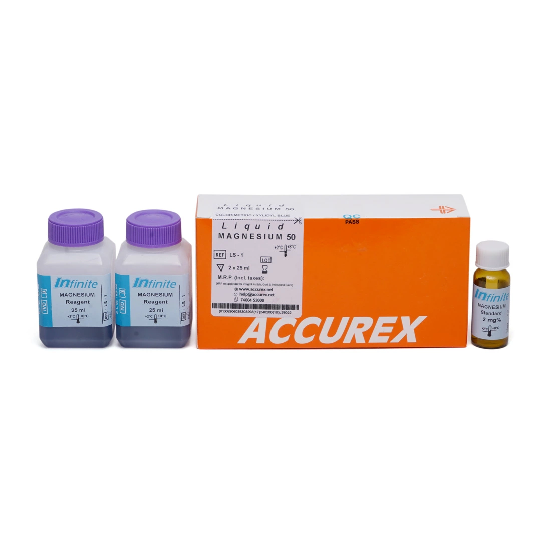 (Pack size: 2X 25ml) from Accurex. Liquid Magnesium reagent kit is used for determination of magnesium concentration in human serum and plasma based on colorimetric blue method.